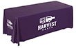 Tablecloths can either be 3 sided or 4 sided and come in 8, 6, and 4-foot table lengths. 3 sided hang down to the floor on the front and two sides with approx. 6ʺ in the back to allow access for chairs and/or storage. 4 sided covers all 4 sides to the floor. All the material starts off white and we print to the color you need.